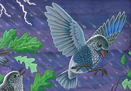 Suddenly the clouds erupt into a violent thunder storm. A blinding flash of light startles the bluebirds, and they scatter like leaves in the wind. Can the bluebirds survive such a terrible storm?
