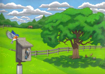 The female builds a nest with dried grass, and the male feeds her while she works. You can see on of my horses on the hill, and there are a few of my crazy chickens under the tree.