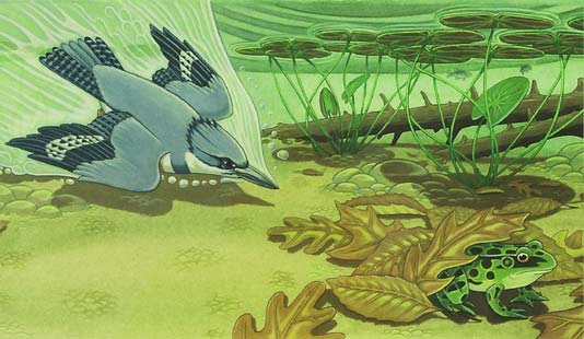 The frog dives into the water. But guess what? Kingfishers can swim and she dives in after him! What will happen to our friend the frog?